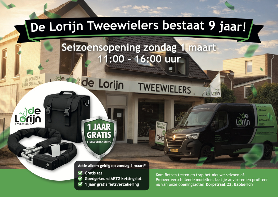 De Lorijn Tweewielers bestaat sinds 2017 en is inmiddels een begrip in Babberich en omgeving. De rijwielzaak verkoopt niet alleen nieuwe en gebruikte fietsen, maar beschikt ook over een professioneel ingerichte werkplaats. Eigenaar Joris de Lorijn is een fietsspecialist in hart en nieren en beschikt over jarenlange praktijkervaring in de fietsenbranche. Een team van ervaren en deskundige fietsspecialisten zorgt ervoor dat reparaties en onderhoudsbeurten bij De Lorijn Tweewielers vakkundig worden uitgevoerd, zowel voor normale fietsen als e-bikes.