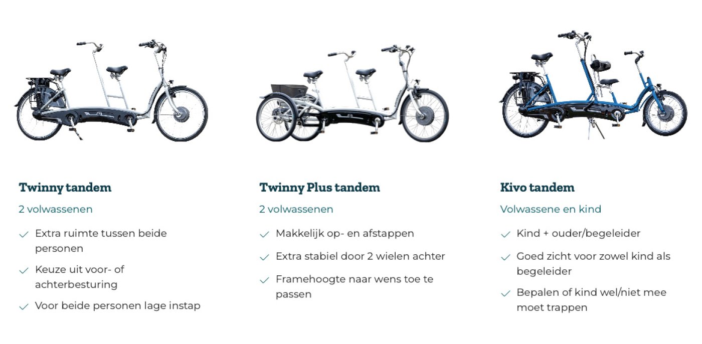 Tandems zijn ideaal om samen te genieten van het fietsen. Ze hebben een lage of zelfs geen instap en kunnen naar wens worden aangepast met diverse opties. Daardoor zijn ze ook geschikt voor mensen die niet meer zelfstandig kunnen deelnemen aan het verkeer.